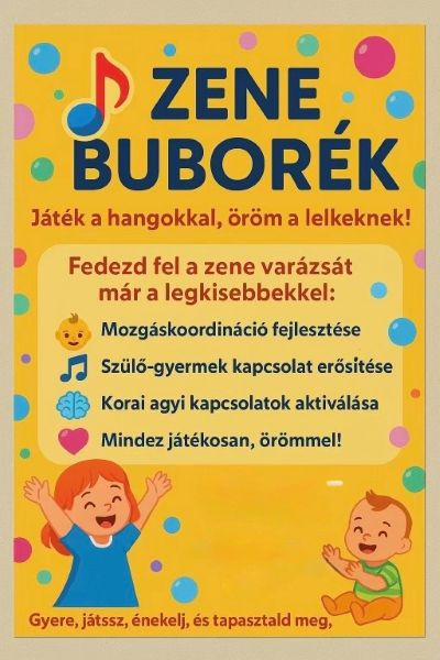 • A ZeneBuborék egy különleges, zenés-mozgásos játék 0–3 éves gyermekeknek és szüleiknek, ahol dalokon, ritmusokon és közös mozgáson keresztül ismerkedünk a zene testre és lélekre gyakorolt csodálatos hatásaival.
