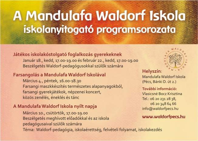 Ha kíváncsi vagy rá, milyen a pécsi Mandulafa Waldorf Iskola, az alábbiakban találod iskolanyitogató programjait: