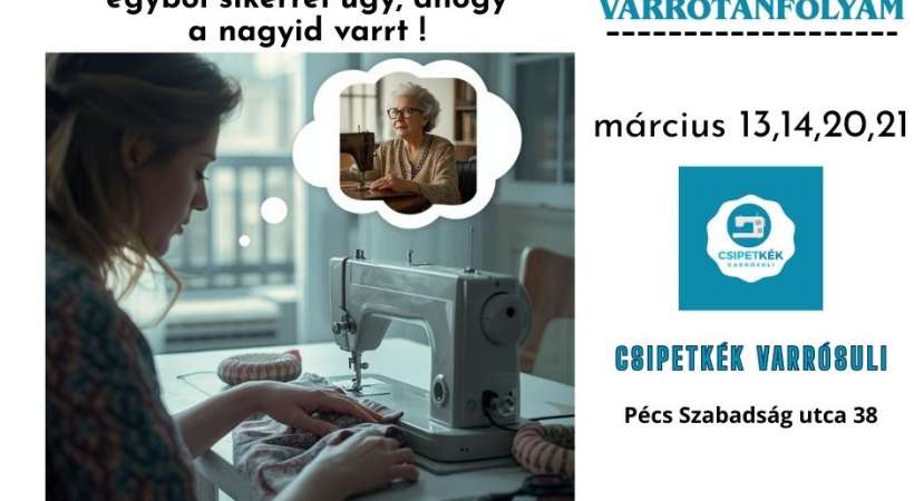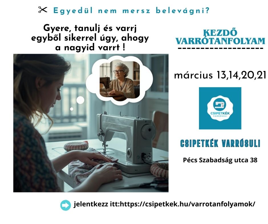 Szeretnèl megtanulni sikerrel varrni?Akkor ne halogasd tovább, végre szakíts magadra időt, s vágj bele most!Foglald le a helyed, mert a helyek száma limitált!Már csak 3 hely maradt az alap és 2 a kezdő kurzusra!Alap 2 alkalmas, : március 13, és 14Kezdő: 4 alkalmas, március 13, 14, 20 és 21Jelentkezési határidő: 10.- eHamarosan jön a haladóknak a szoknya készítő, ,az Együtt lenni jó workshop Anya-lánya, vagy Nagymama-lánya párosnak, és intenzív Kismama kezdő is indul!Áprilisban pedig Húsvétvàró workshop lesz , és szünidei varrótanfolyam is indul tiniknek!Csipetkék Varrósuli Pécs Szabadság utca 38Várlak titeket szeretettel, és élménnyel!Te melyikre jössz?Varrj egyből sikerrel! -Csipetkék VarrósuliBővebb infó:https://csipetkek.hu/.../kezdo-varrotanfolyam.../A tanfolyamokról: https://csipetkek.hu/varrotanfolyamok/