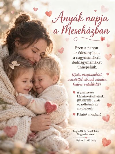 Időpont: 2026. Május 3. (vasárnap) 11:00 Helyszín: Legendák és mesék háza, Magyarhertelend, Petőfi Sándor utca 11/c. Ezen a napon az édesanyákat a nagymamákat, dédnagymamákat ünnepeljük. Közös programként szeretettel várunk minden kedves érdeklődőt!