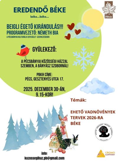 Időpont: 2025. December 30. (kedd) 09:15 Helyszín: Pécsbányai Közösségi Ház Teljességgel személyesen kirándulunk, sétálunk a téli erdőben, a jó levegőn, együtt...és közben észrevétlenül égetjük a kalóriákat!