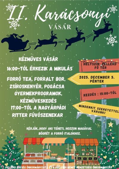 2. Pellérdi Karácsonyi Vásár- Ünnepi hangulat és kézműves csodák! Tarts velünk egy varázslatos délutánra Pellérd Fő terén (az önkormányzat előtt)!