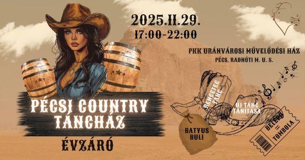 Találkozzunk 2025 utolsó pécsi country táncházas eseményén és töltsünk együtt öt órát remek country zenékkel és táncokkal, nagyszerű társaságban, jó hangulatban!