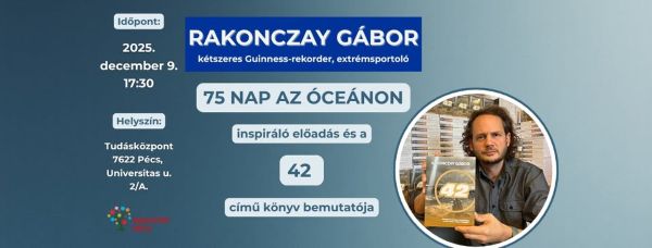Rakonczay Gábor, kétszeres Guinness-rekorder, extrémsportoló és hétszeres óceánátkelő, december 9-én a Tudásközpont Nagytermében mesél legújabb útjáról, és bemutatja új könyvét, a „42”-t.