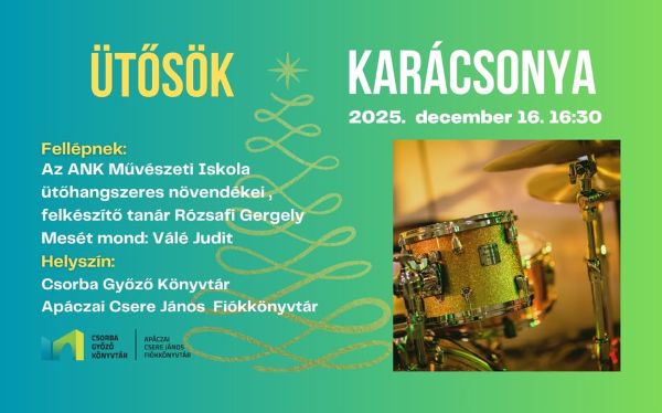 Időpont: 2025. December 16. (kedd) 16:30 Helyszín: Csorba Győző Könyvtár Apáczai Csere János Fiókkönyvtá rSzeretettel várunk minden érdeklődőt 2025. december 16-án az Apáczai Csere János Fiókkönyvtárban megrendezésre kerülő Ütősök karácsonya című koncerten.