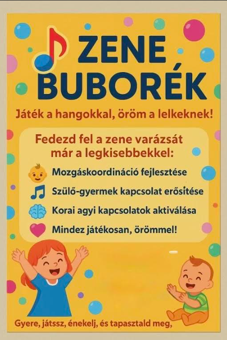 A ZeneBuborék egy különleges, zenés-mozgásos játék 0–3 éves gyermekeknek és szüleiknek, ahol dalokon, ritmusokon és közös mozgáson keresztül ismerkedünk a zene testre és lélekre gyakorolt csodálatos hatásaival.