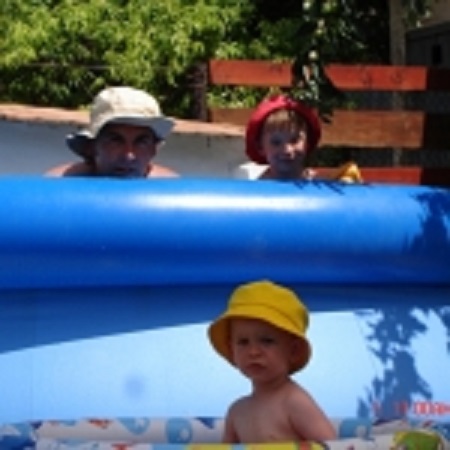 Meleg júliusi délelőtt hűsöl a család, ki-ki a neki megfelelő méretű medencében...(Anya a pillanat megörökítése után csobbant...) Így el lehet viselni a hőséget...:))
