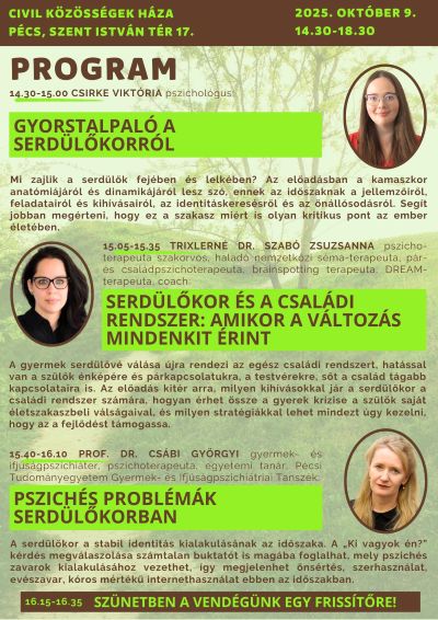 - prof. dr. Csábi Györgyi gyermek-és ifjúságpszichiáter, egyetemi tanár: Pszichés problémák serdülőkorban